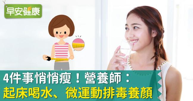 1. 喝一大杯水早上起床建議第一件事情就是先補充水分,大約要250-300CC以上,以溫開水為為佳。一早起床,身體經過數小時缺水,是最需要補水的時候。此時補充水分,能讓身體細胞完整吸收水分,並能有效刺激腸胃蠕動,促進新陳代謝。