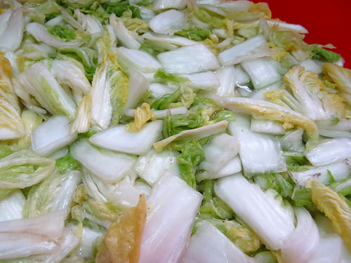 山東大白菜剝除外面綠葉,對切開,去中心硬梗,葉梗直切三刀,再橫切適當大小(約3cm寬,5cm長)